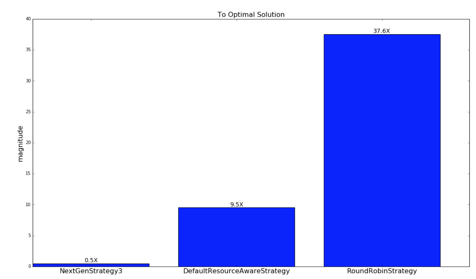 The next graph displays how close the schedulings from the respectively scheduling strategies are to the schedulings of the optimal strategy. As explained earlier, this is only done for the random generated topologies and clusters.