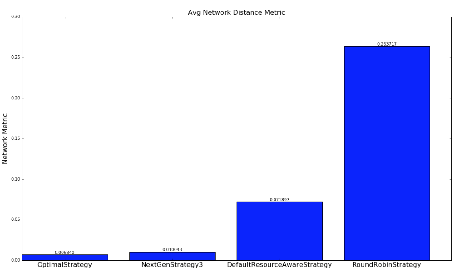 The below graphs provides a comparison of how well the various strategies schedule topologies to minimize network latency. A network metric is calculated for each scheduling of a topology by each scheduling strategy. The network metric is calculated based on how many connections each executor in a topology has to make to another executor residing in the same worker (JVM process), in different worker but same host, different host, different rack. The assumption we are making is the following